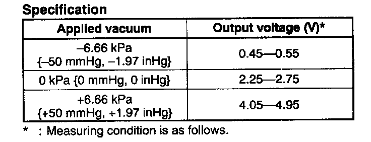 6. Decrease the applied pressure from +6.66 kPa {+50 mmHg, +1.97 inHg} to -6.66 kPa {-50 mmHg, -1.97 inHg} and verify that the PCM terminal 62 voltage decreases accordingly as specified.