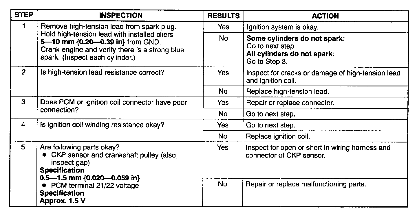 WARNING: High voltage in the ignition system can cause strong electrical shock which can result in serious Injury. Avoid direct contact to the vehicle body during the spark test.