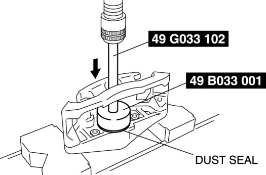 1. Assemble a new dust seal to the caliper using the SSTs and a press with a press-in force of 834 N {85 kgf, 187 in-lbf}.