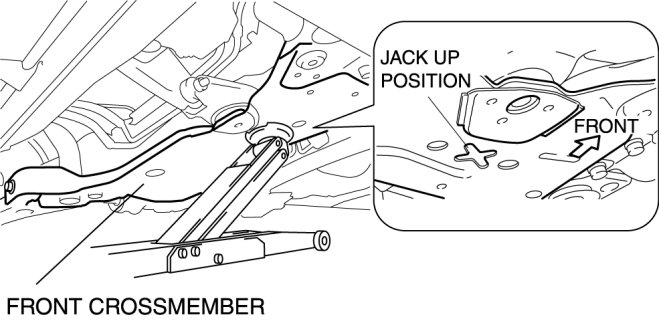 - Place a board (approx. 20 mm {0.78 in} thick) between the rear crossmember and the jack to prevent damage to the crossmember.
