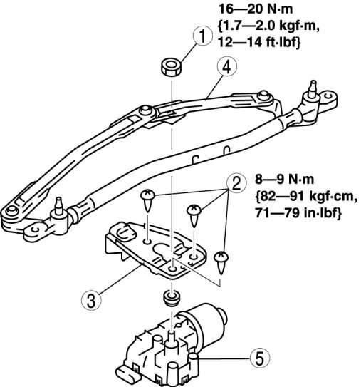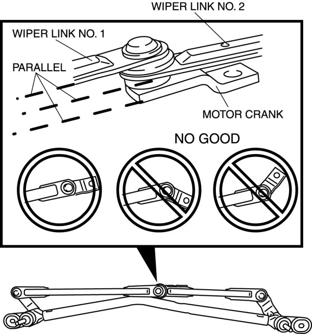 4. Adjust the motor crank and wiper link No. 1 so that they are parallel with each other as shown in the figure and assemble them to the windshield wiper motor shaft.