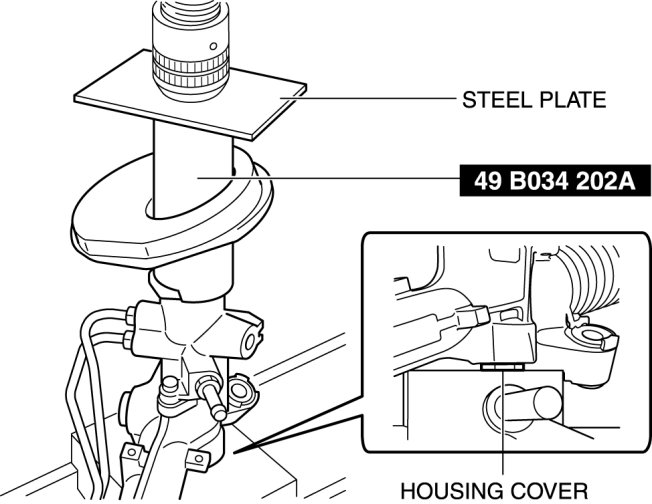 - Set the steering gear and linkage to the press with the housing cover facing down as shown in the figure.