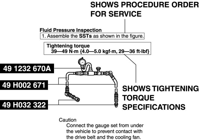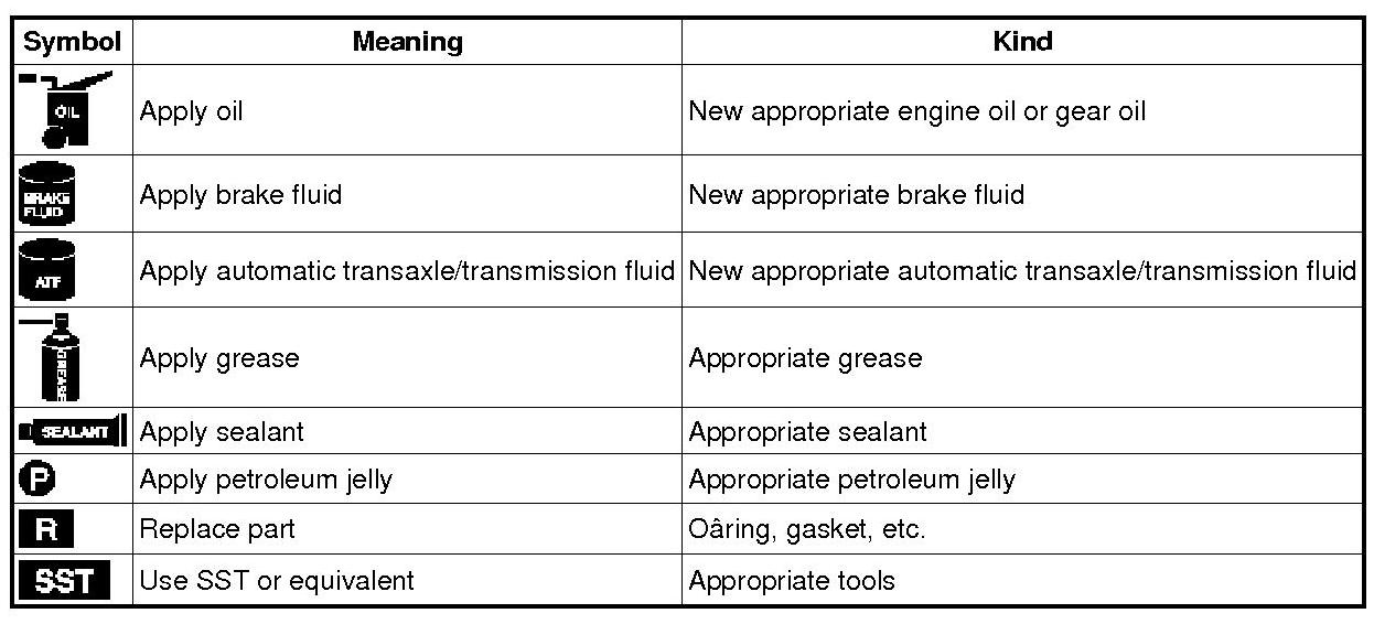 - There are eight symbols indicating oil, grease, fluids, sealant, and the use of SST or equivalent. These symbols show application points or use of these materials during service.