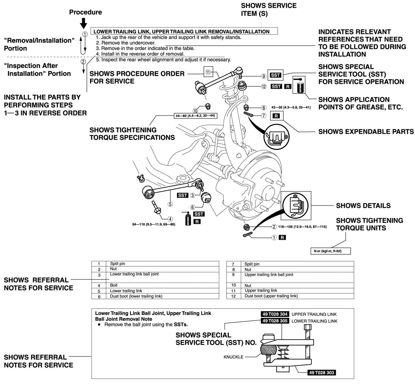 - Symptom troubleshooting shows diagnostic procedures, inspection methods, and proper action to be taken for each trouble symptom.
