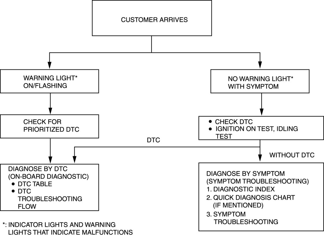 - The appropriate diagnostic inspection relating to a malfunction cause as specified by the symptoms can be selected by looking down the diagnostic inspection column of the chart.