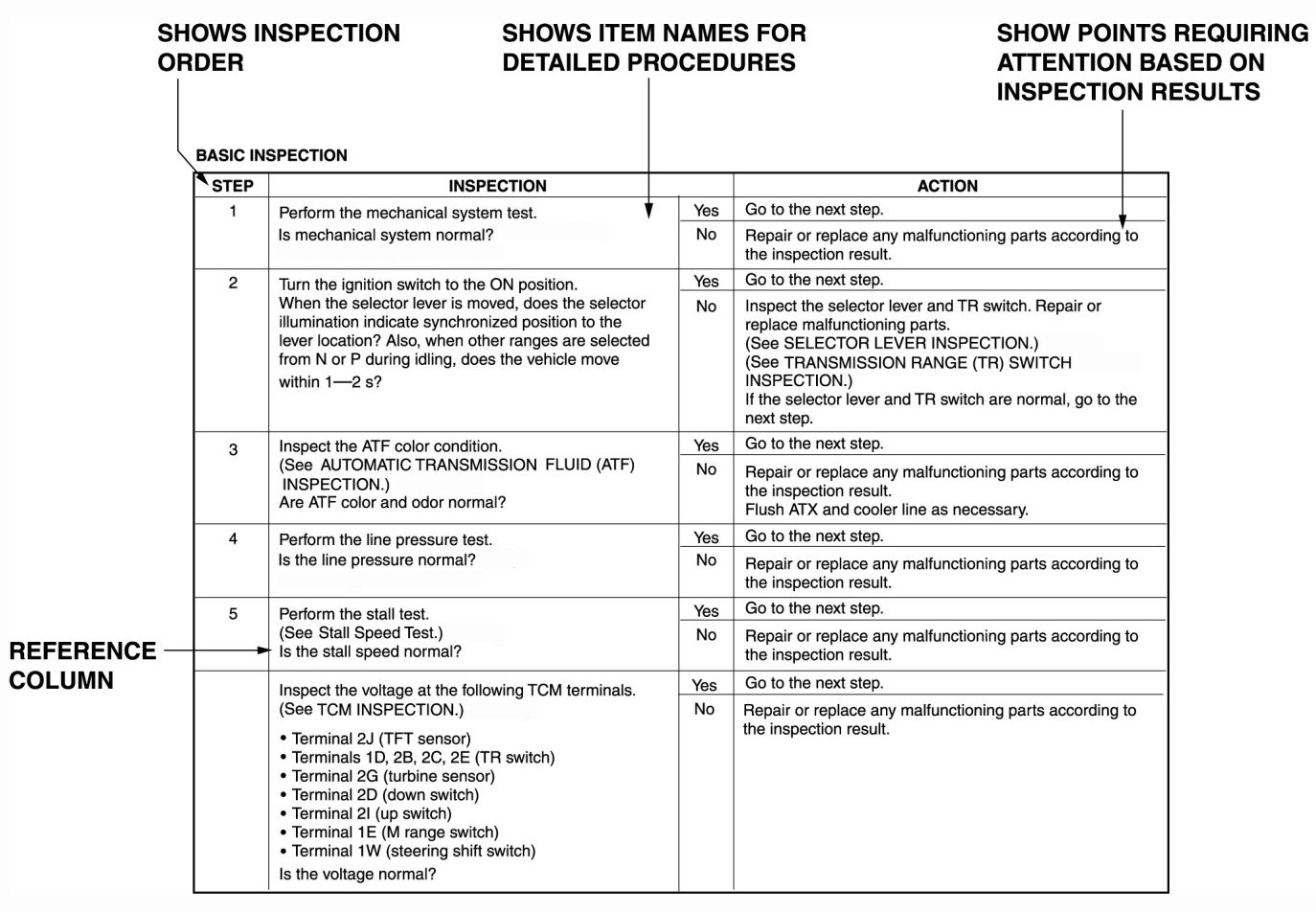 - Although inspections and adjustments are performed according to the reference column procedures, if the cause of the malfunction is discovered during basic inspection, continue the procedures as indicated in the action column.