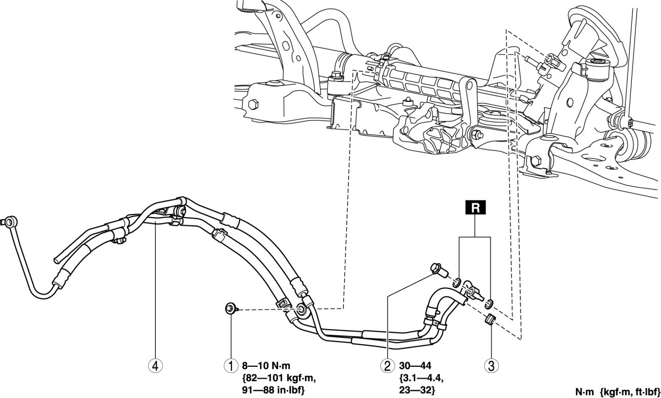- The following procedure is for replacement of the parts shown in the figure. Regarding replacement of the suction hose and return hose, refer to the electric power steering oil pump component removal/installation. Removal and Replacement