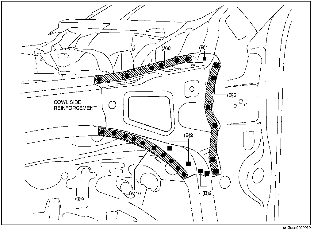 5. Plug weld the 11 locations indicated by (B) shown in the figure while install the cowl side reinforcement.