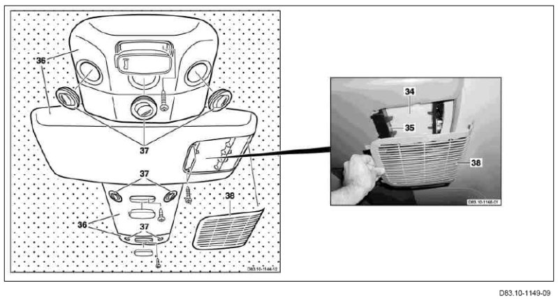 The dust filter is inserted in the frame and located behind the dust filter grill in the rear automatic air conditioning air recirculation unit (A32/2), which is integrated in the roof air duct.