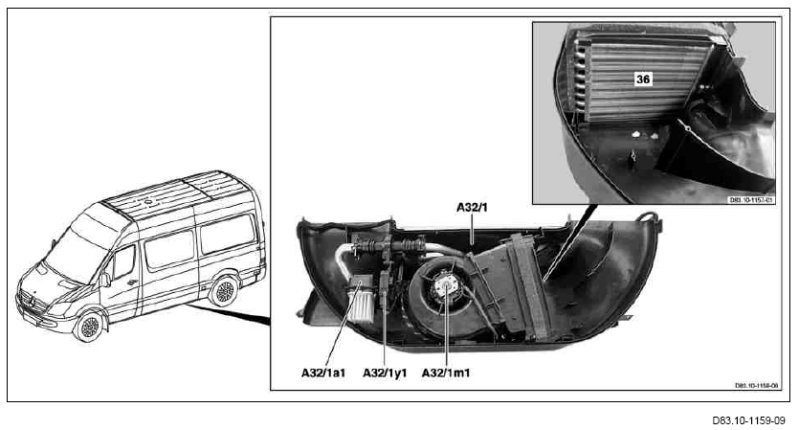 The rear heater water valve consists of the housing, the rear heater water valve motor (A32/1m2), the flap and the rear heater water valve potentiometer (A32/1r1).