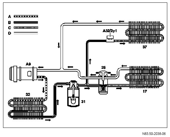 The refrigerant compressor driven by the engine compresses the gaseous refrigerant that is drawn in by the low pressure (D), causing it to heat up. Then the gaseous refrigerant is routed into the front condenser by the high pressure (A), where the compression heat is removed over the surface of the front condenser, thus cooling down the refrigerant. As it is cooling down, the refrigerant liquefies (condenses). Then the liquid refrigerant is routed to the front desiccant cartridge by the high pressure (liquid) (B). Any contamination or water content in the liquid refrigerant is removed in the front desiccant cartridge. After cleaning in the front desiccant cartridge, the liquid refrigerant is routed by the high pressure (liquid) to the front expansion valve and to the refrigerant shutoff valve with the integrated rear expansion valve. The front expansion valve regulates the flow of refrigerant to the front evaporator depending on the low pressure (gaseous) and the temperature at the front evaporator outlet.