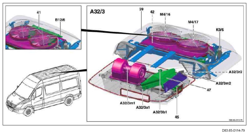 The evaporator temperature sensor measures the temperature at the roof air conditioning evaporator and transmits this value to the AAC [KLA] control and operating unit (S98).
