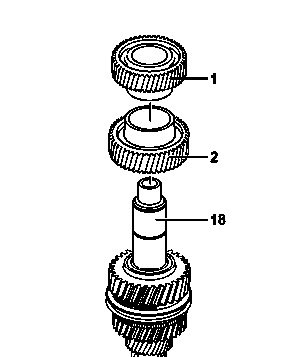 When pressing off the constant speed gear (1), fixed gear of 6th gear (2) and synchronizer unit of 3rd/4th.gear, support countershaft (18) from underneath to protect it from falling down.