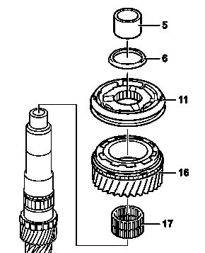 7 Press off idler gear of 4th gear (16), synchronizer unit of 3rd/4th gear (11), thrust plate (6) and bearing bushing of 3rd gear (5).