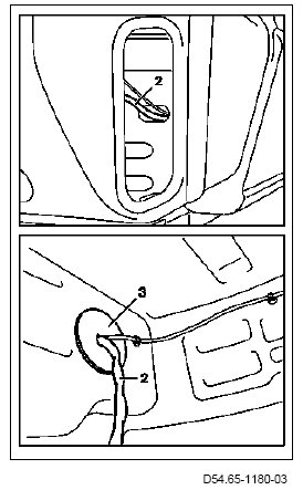 2 Route wiring harness for sensors (2) downwards through the opening in the right rear pillar.