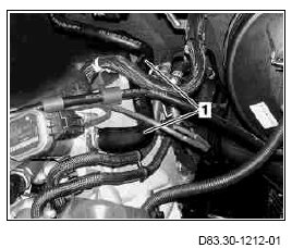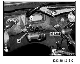 1 Remove coolant hose (1) from engine to heater heat exchanger.