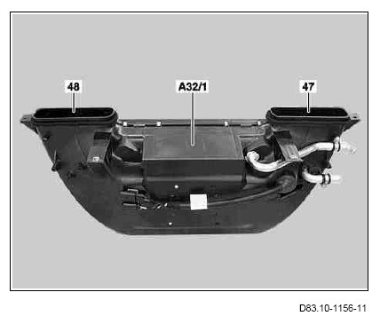 The rear heater blower motor (A32/1m1) takes in the recirculated air from the passenger or load compartment of the vehicle via the intake air duct. The rear blower control button (+) and the rear blower control button (-) are used to control the rate of circulation of the recirculated air with the help of the rear heater blower motor.