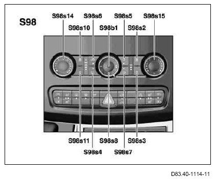 The AAC [KLA] control and operating unit controls the rear heater blower regulator (A32/1a1). The rear heater blower regulator regulates the voltage applied at the rear heater blower motor. The rear blower control button (+) and the rear blower control button (-) can be used to adjust the output of the rear heater blower motor in the following stages via the rear heater blower regulator: