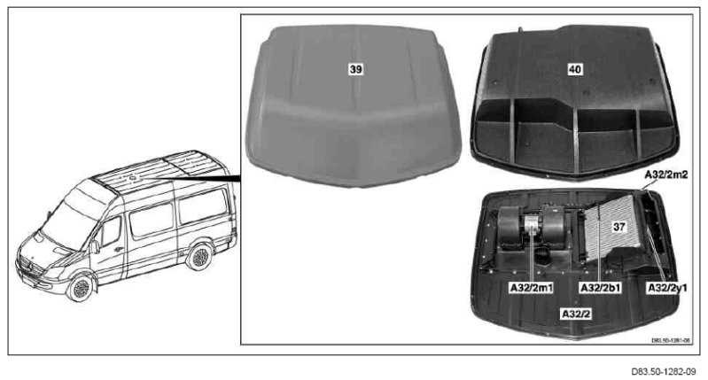 The rear automatic air conditioning air recirculation unit serves to distribute the recirculated air required for ventilation in the passenger or load compartment of the vehicle to the roof air duct and the air nozzles that can be swiveled and closed. The rear automatic air conditioning recirculation unit performs this depending on the specified temperature set using the rear temperature selection switch (S98s15) integrated into the KLA control and operating unit (S98) and depending on the blower stage set using the rear blower control button (+) (S98s2) and the rear blower control button (-) (S98s3) integrated into the KLA control and operating unit.