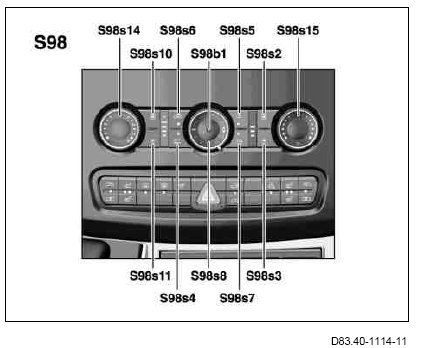 The rear heater is actuated using the rear air conditioning button integrated in the KLA control and operating unit. Activation of the rear heater is indicated by illumination of the red light emitting diode (LED) in the rear air conditioning button.