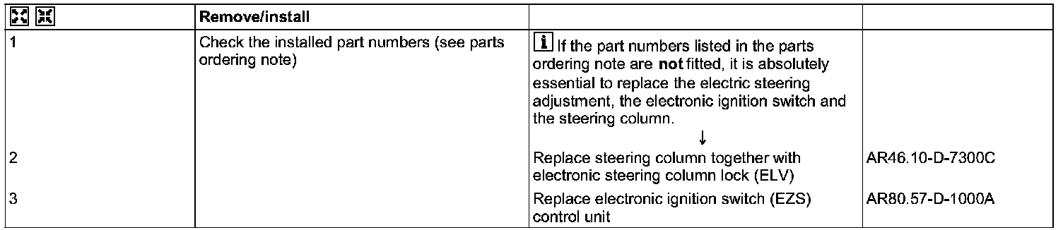 When starting, the electric steeringlock(ELV) is not enabled. The key cannot be turned in the electronicignition switch(EZS). The installed part numbers must be checked. If the listed part numbers are not installed, the ELV, EZS and the steering column must be replaced.