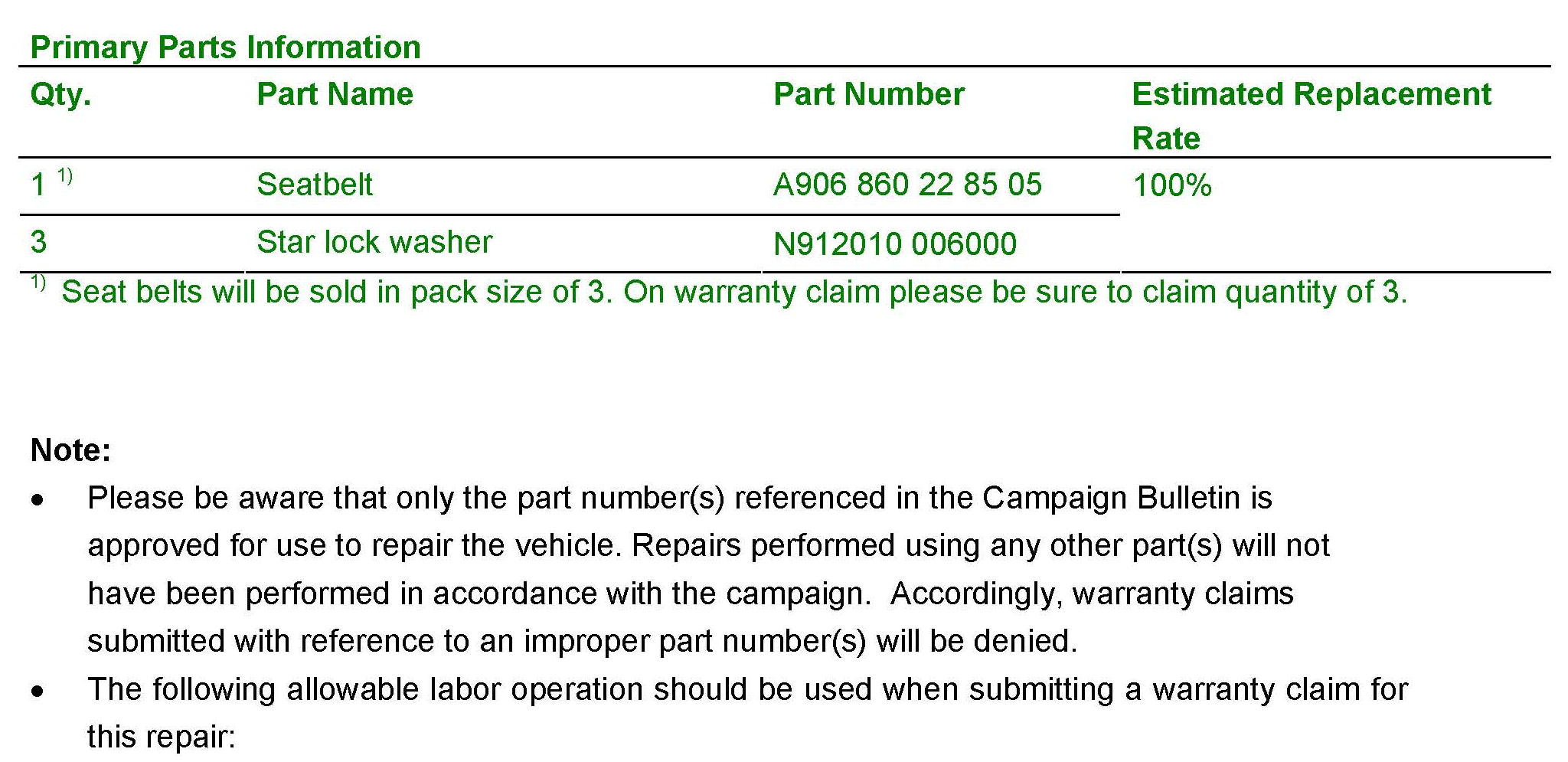 Daimler AG (DAG), the manufacturer of Mercedes-Benz and Freightliner Sprinter vehicles, has determined that incorrect seat belts may have been installed in the second seat row of the passenger compartment. Dealers must check the seat belts on both 3 passenger seat benches to ensure no