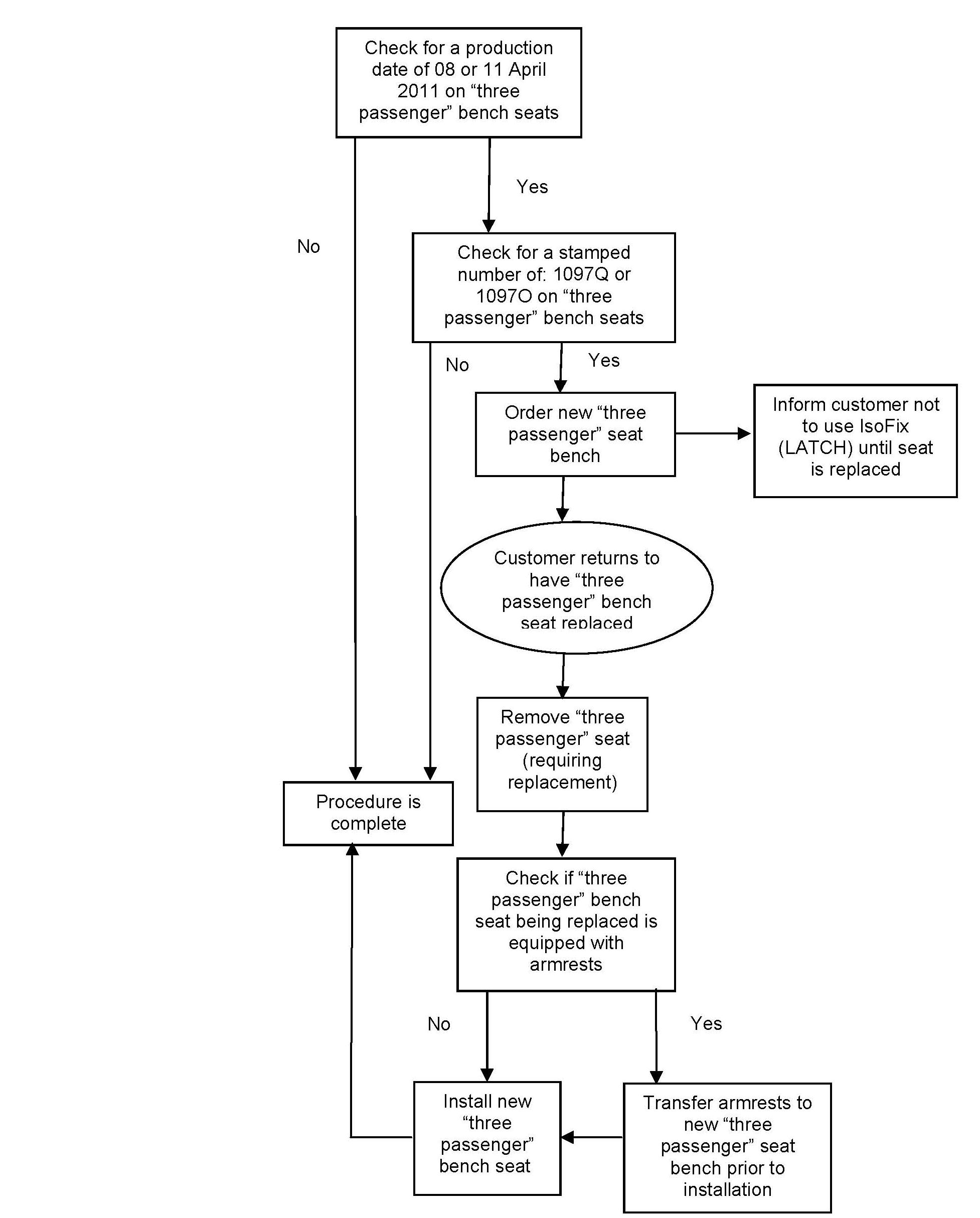 The "three passenger" bench seats will be checked for production date and stamped number. If production date is 08 or 11 April 2011 and the stamped number is: 1097Q or 1097O the bench seat(s) require(s) replacement. If the bench seat(s) requiring replacement is/are equipped with armrests, the armrests must be transferred to new bench seat. Please note, this summary does not include all the steps in this Procedure.