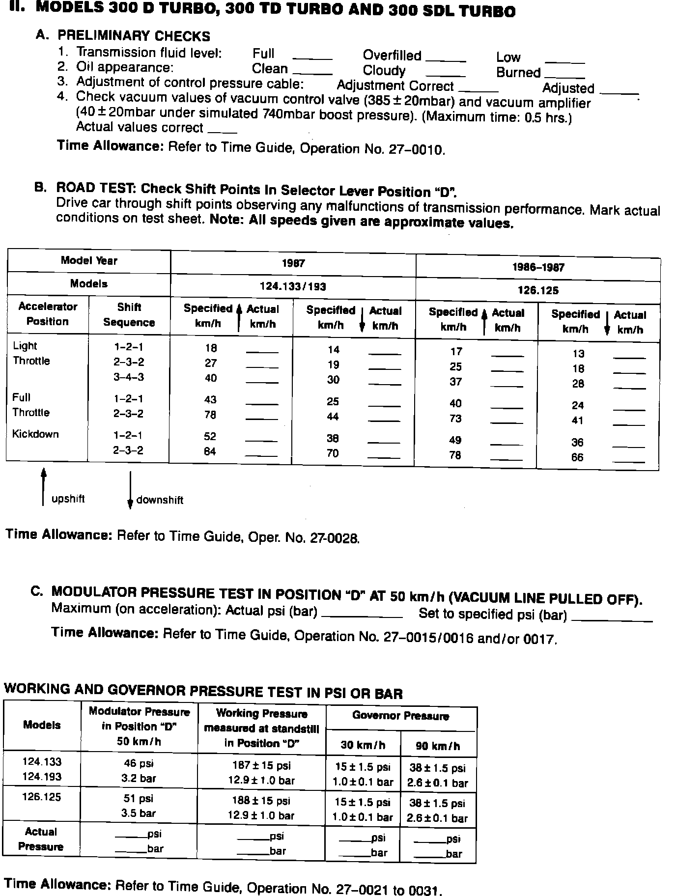 SUBJECT: TEST SHEET FOR AUTOMATIC TRANSMISSION, TYPE W4A040 MODEL YEARS 1986 - 1987 WHEEL ALIGNMENT AND CHASSIS MEASUREMENT WORKSHEET, ALL MODELS
