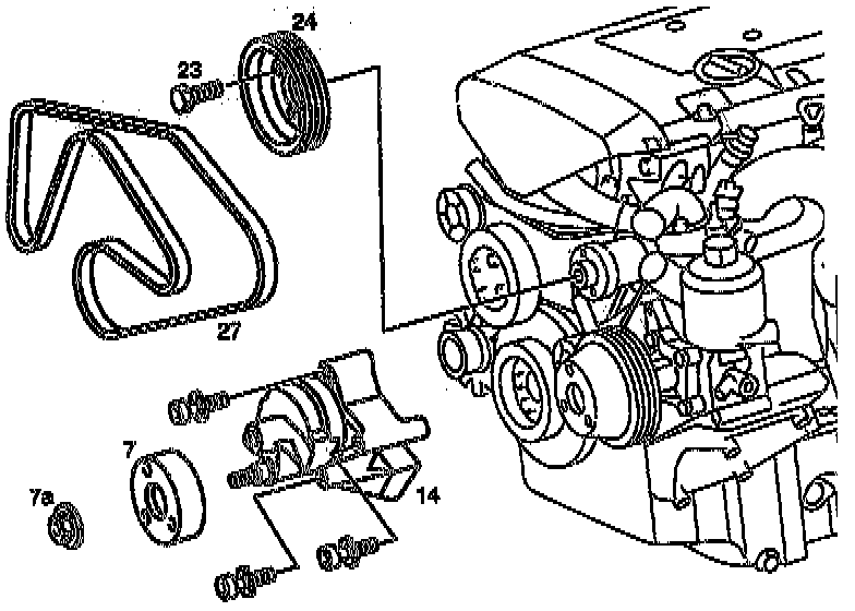 - Tighten bolts (23) of belt pulley of coolant pump (24) to 32 Nm
