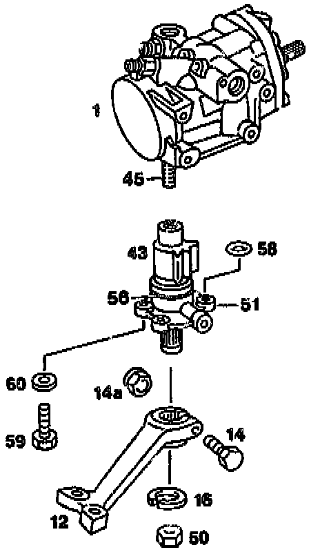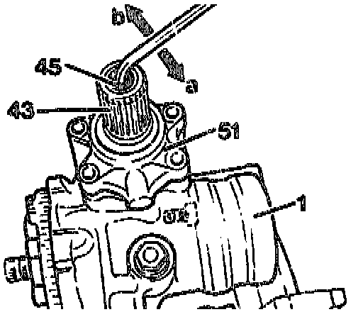 9. With steering in center position, turn adjusting screw (45) clockwise; this causes the pitman arm shaft (43) together with the pitman arm shaft/bearing cover (51) to be pressed out of the steering housing (1).