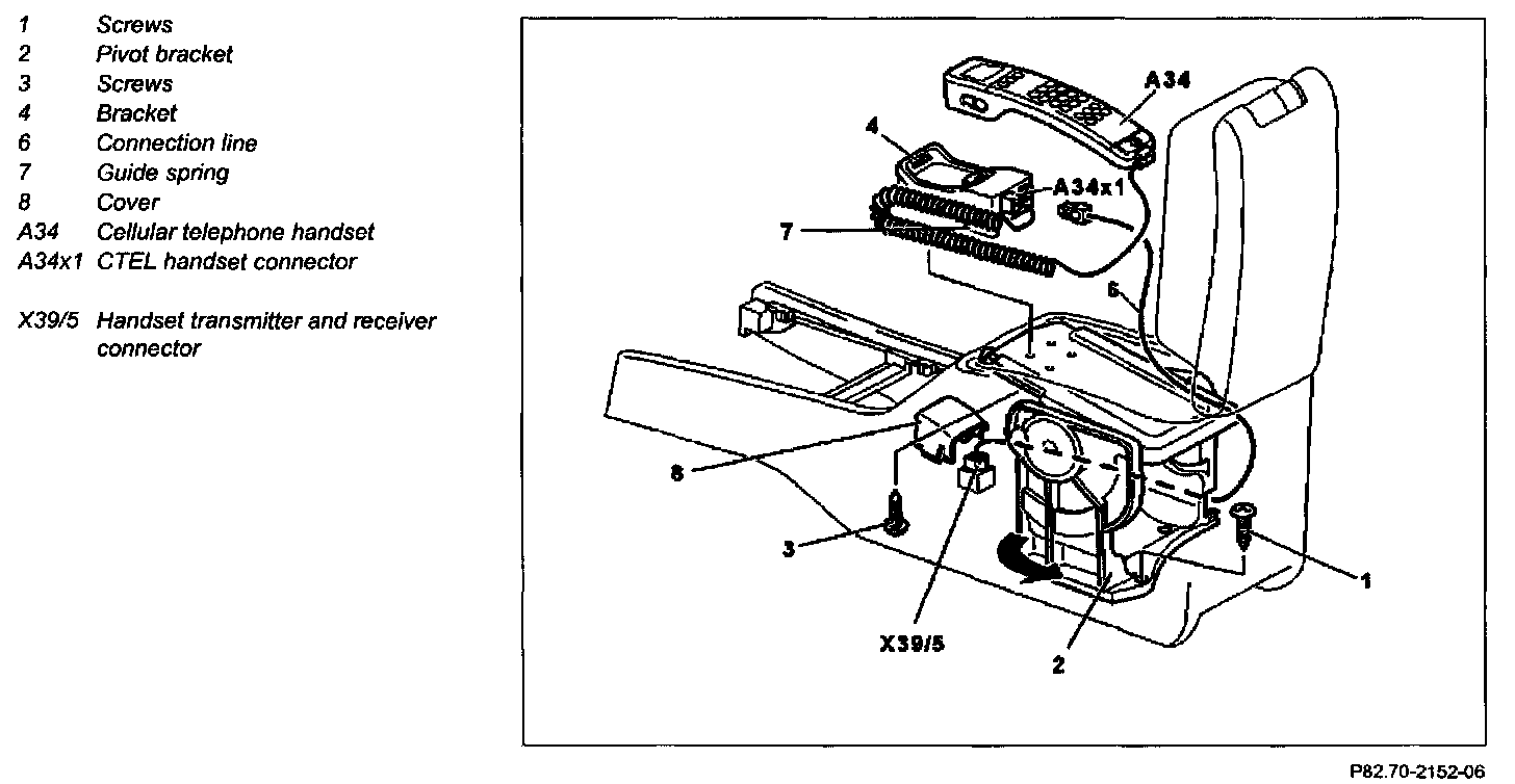 1 Disconnect CTEL handset connector (A34x1) and unhook guide spring (7). Remove CTEL handset (A34)