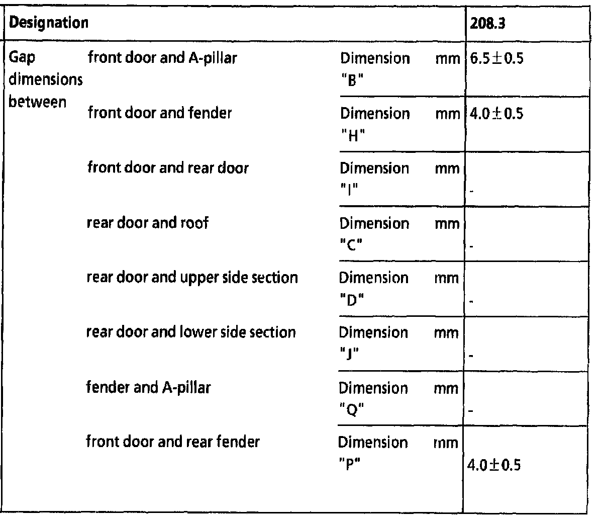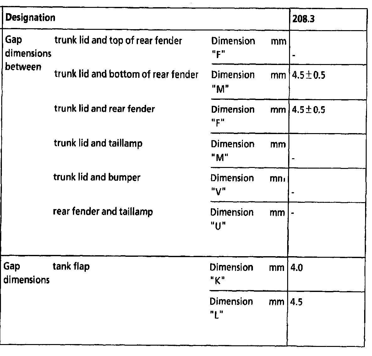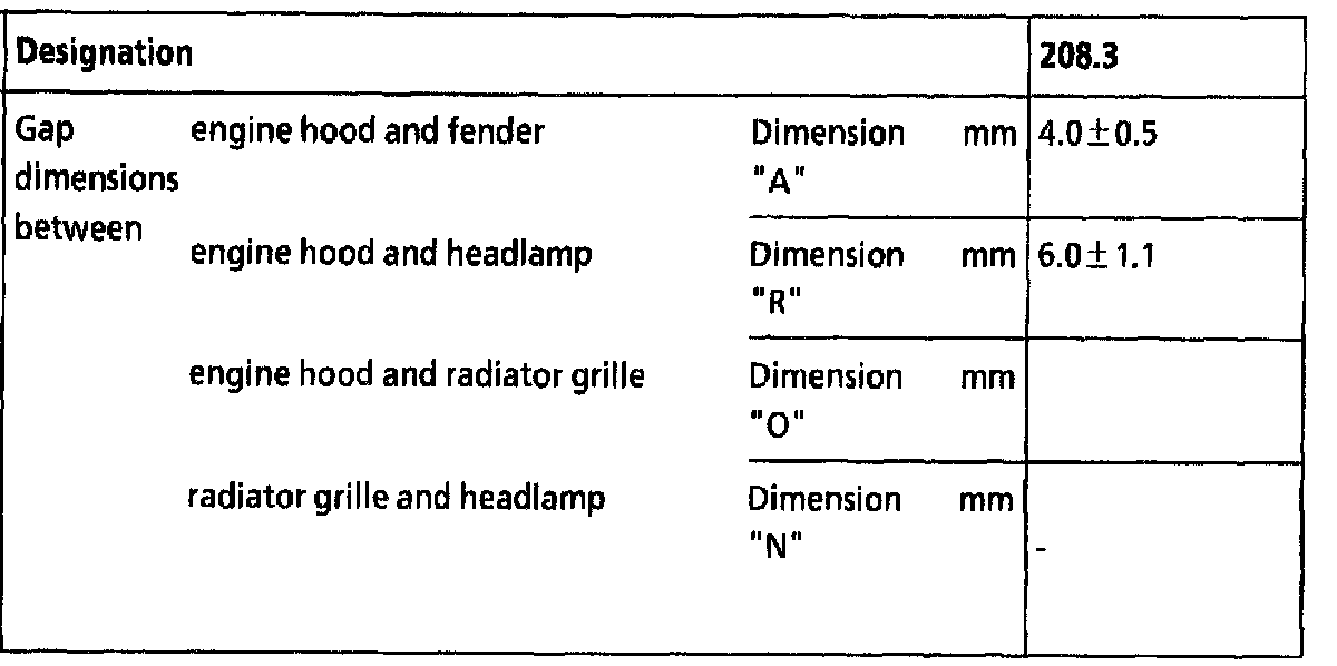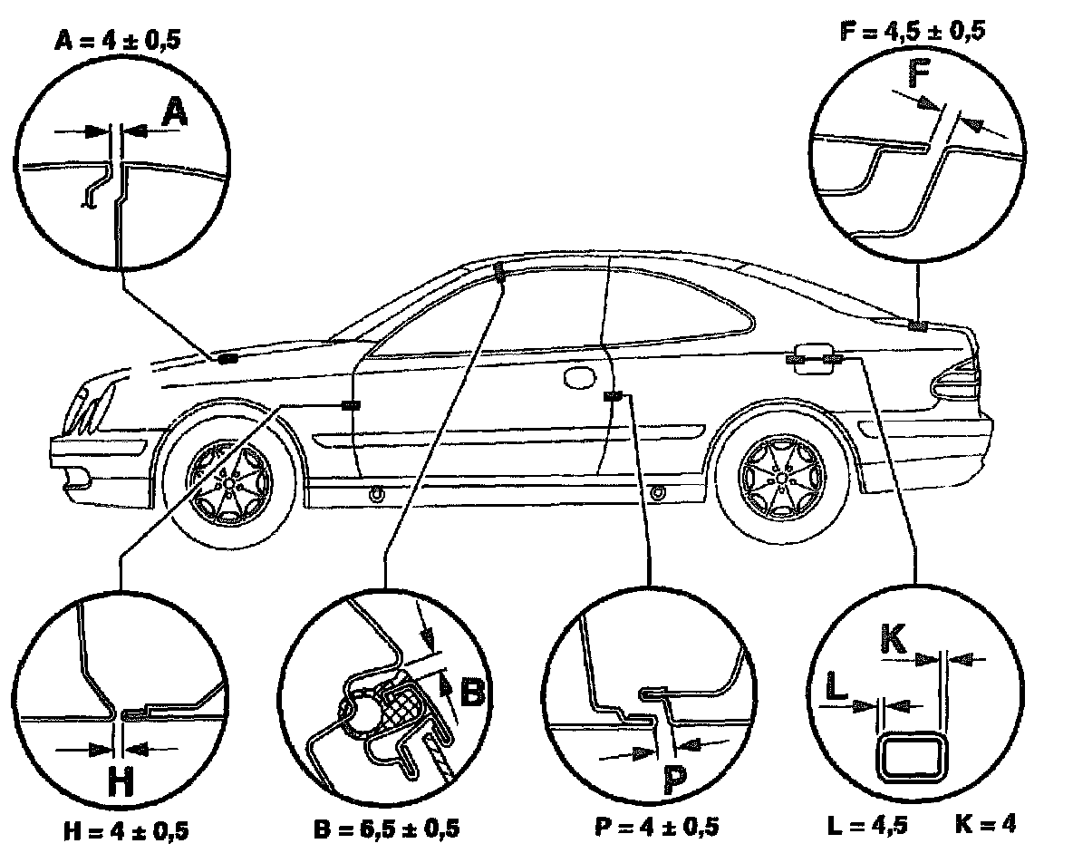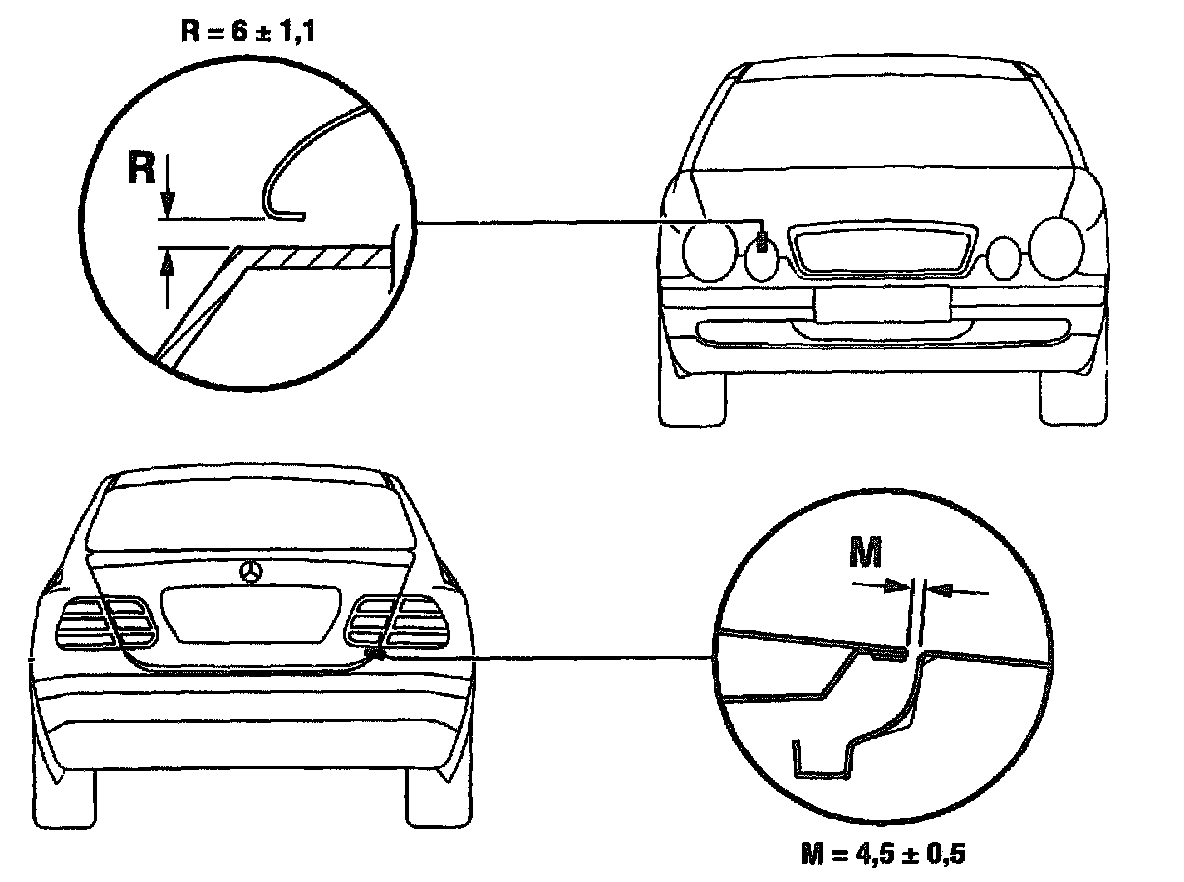 NOTE: Adjust gap dimensions on hoods, door and flaps according to drawing. The gap should not be wedge shape or narrower at points. Deviations from parallel gap should not be greater than max. 0.5 mm over entire length. If inside openings are too large or too small center movable body parts accordingly. The guidelines apply for repair work to bodies damaged in an accident.