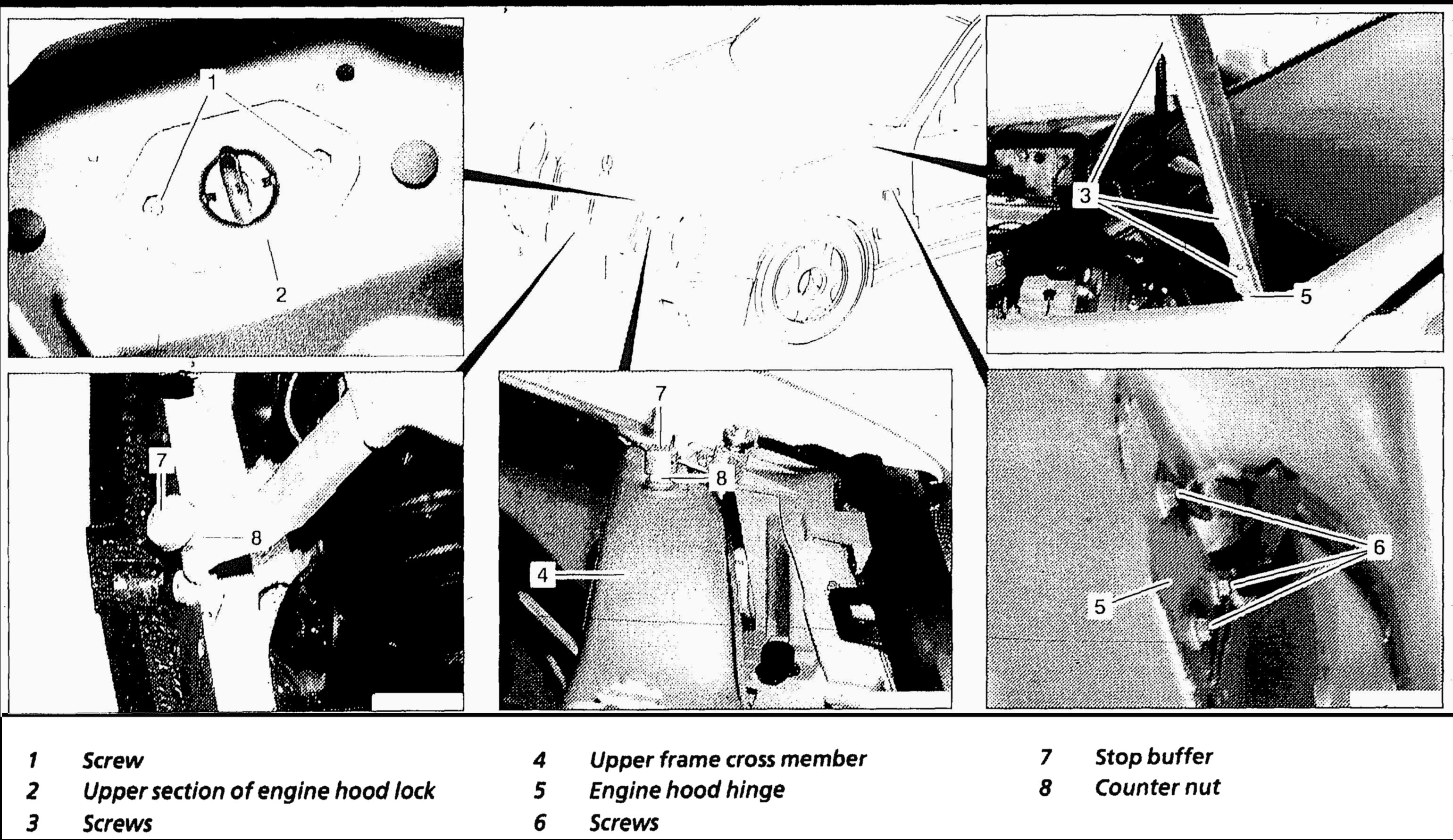 Screws (1) on upper section of engine hood lock: 8 Nm