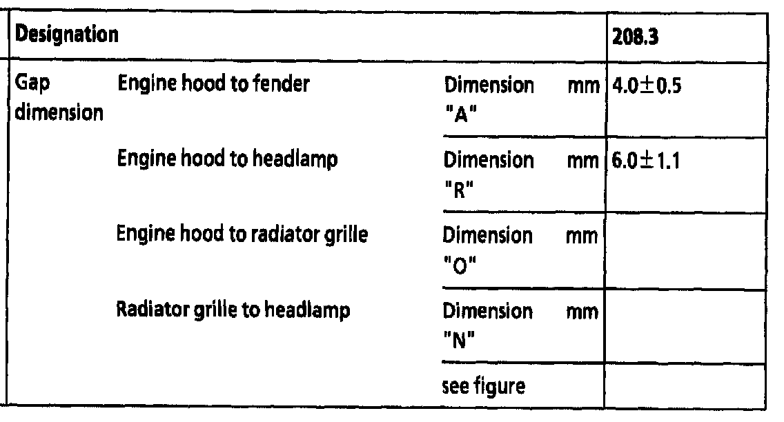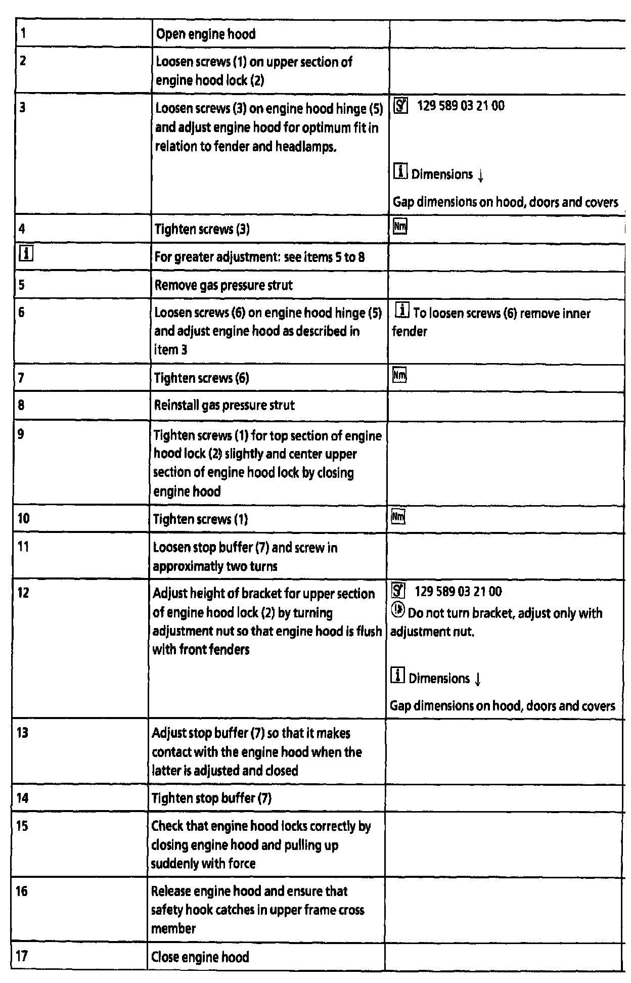 Check and adjustment values for gap dimensions on hood, doors and covers