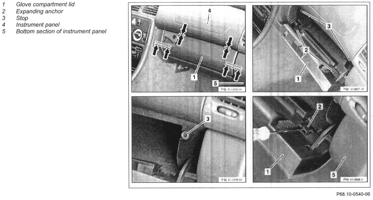 5 Adjust lateral transition (contour) of glove compartment lid (1) to bottom section of instrument panel (4) with stop (3) by screwing stop (3) in or out