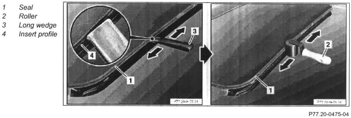- To reduce gap: Move seal (1) with long wedge (3) under pressure uniformly from bottom to top in joint between insert profile (4) and seal (1). Move long wedge at an angle to joint