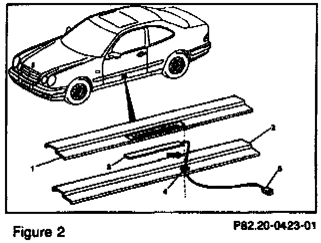 1. Remove installation kit from the boxes and verify all the parts.1. Attach illumination foil (3) with an adhesive tape to the underside of the new metal door sill panel (1, Figure 2). The silver side of the illumination foil should be on the bottom and exiting wires and connector (5) in the rear.