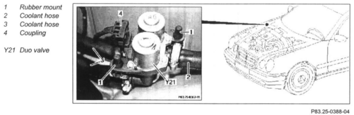 5 Push duo valve (Y21) upwards and remove coolant hoses (3)