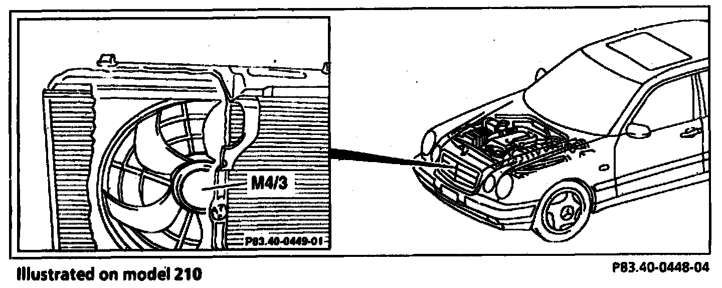 The electric suction-type fan (engine/A/C) (M4/3) is located behind the radiator grille.