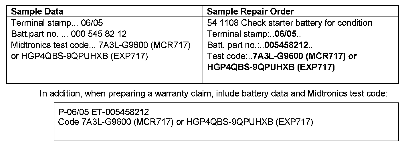 3. On the repair order please include the following information in the technician's story: Terminal Stamp, Battery Part Number (being removed from the car) and the Midtronics Test Code. The Midtronics printout should be stored in a tamperproof manner with the repair documents. To ensure that the Midtronics printout can be assigned at any given time to the repair documents, the Midtronics printout must bear the test date and the vehicle identification number.