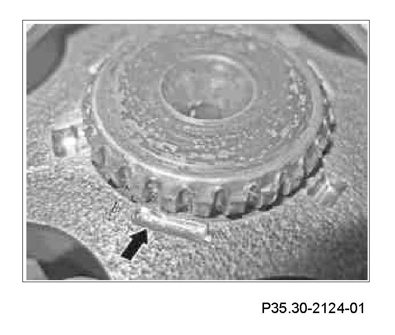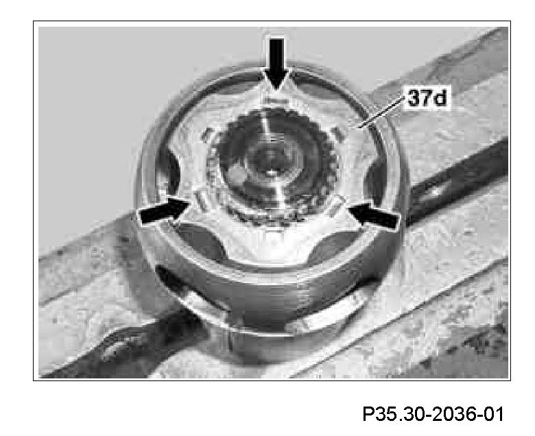 If on the splined profile of the joint hub (arrow) not more than 3 teeth per caulking, up to a maximum length of 6 mm, have broken out, the joint hub (37d) can continue to be used.