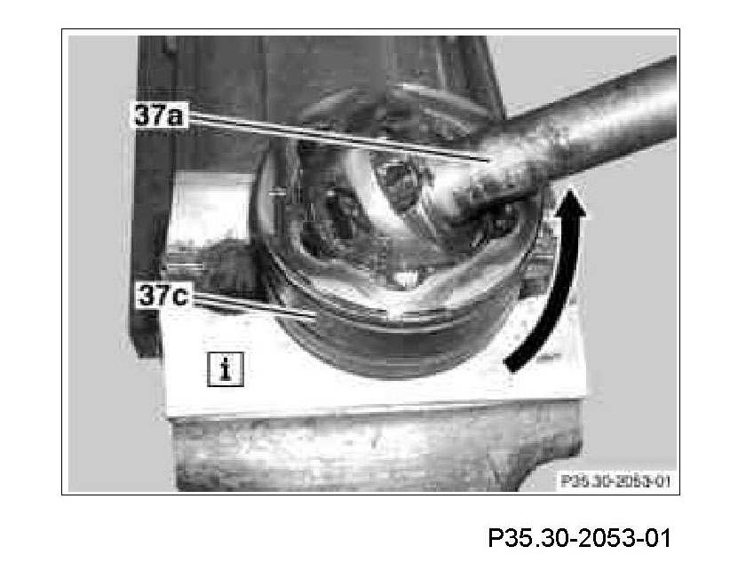 4 Tilt rear axle shaft (37a) and turn slightly to remove from the joint ring (37c).