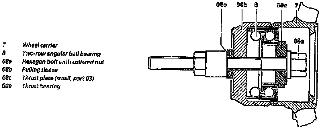 5. Remove the two row angular ball bearing from wheel carrier as follows: