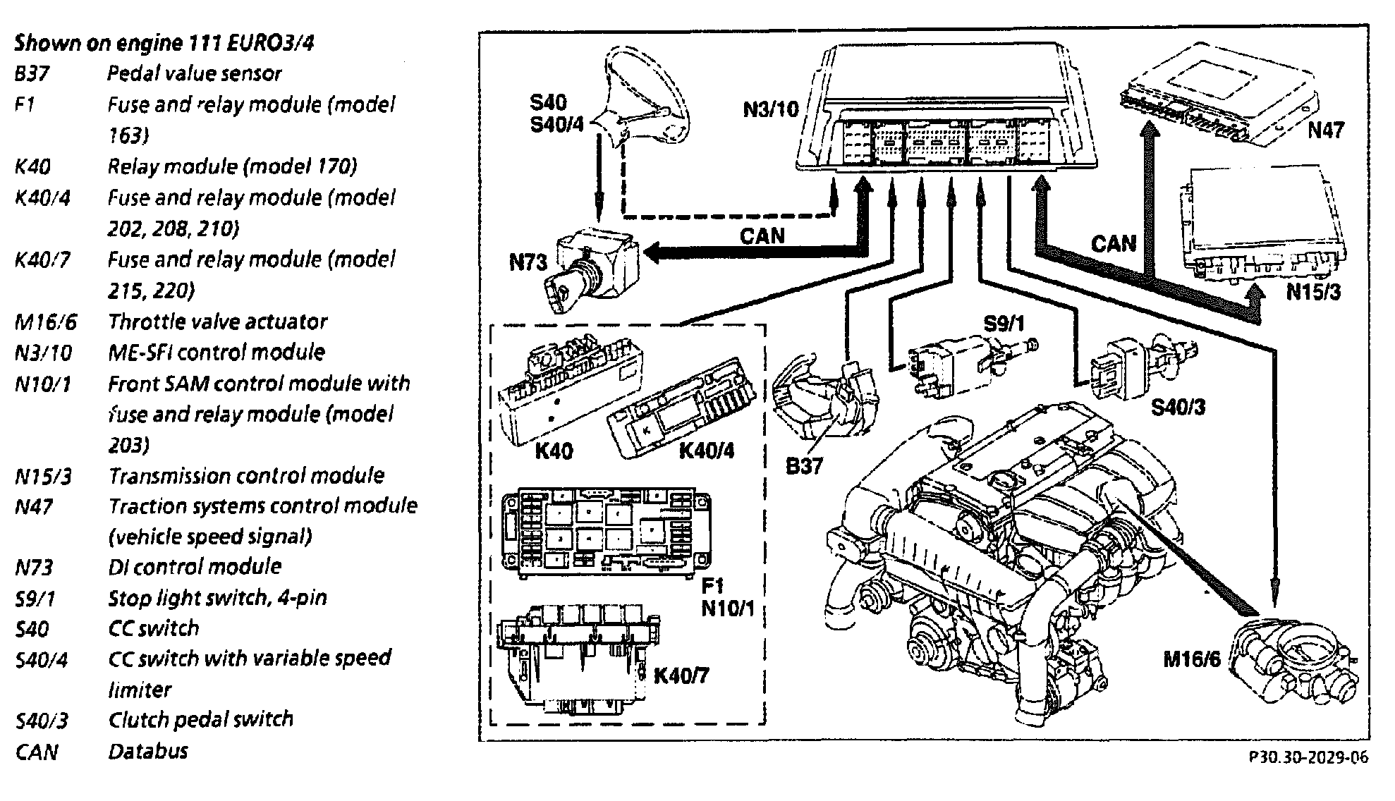 The cruise control function is integrated in the engine control module. It can be activated with the cruise control switch from > 40 km/h. The engine control module operates the throttle valve actuator for the cruise control function with the aid of the input signals and the position of the cruise control switch.