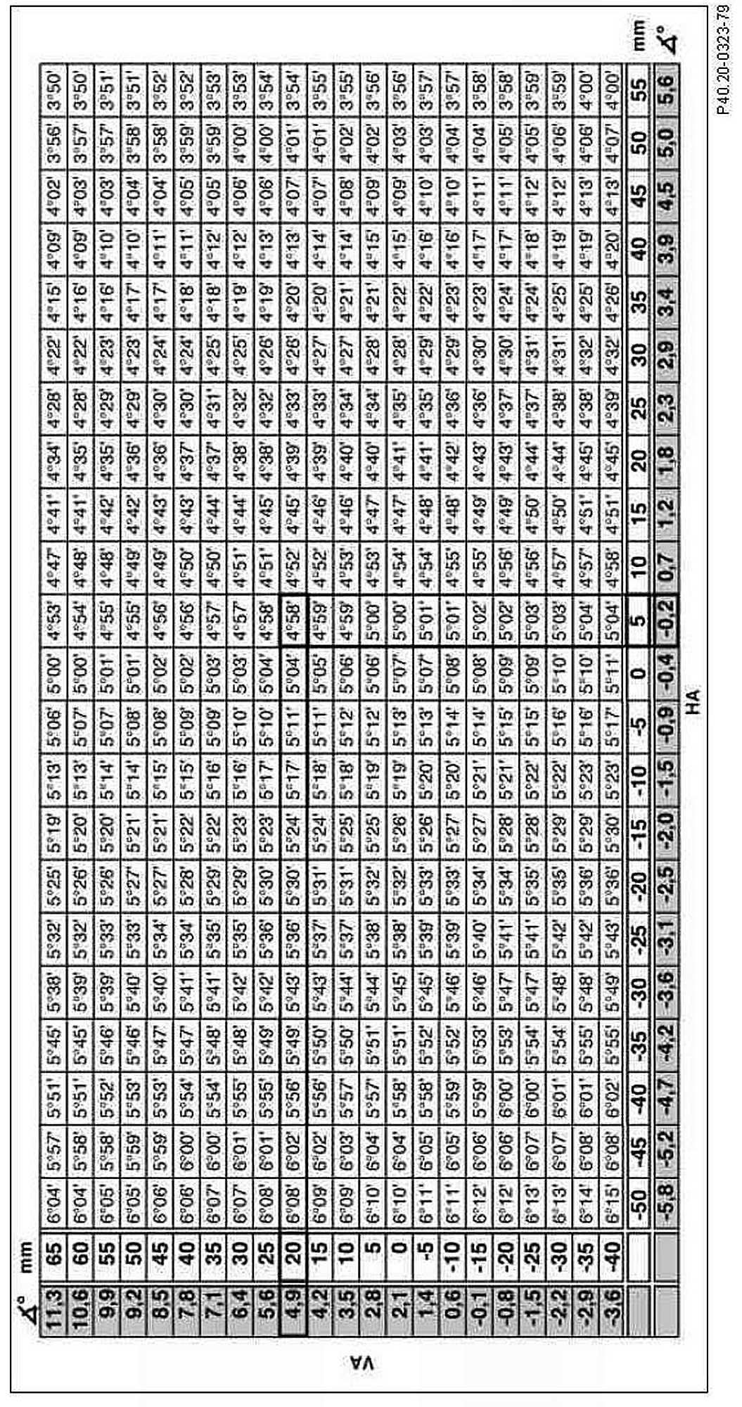 Example: Front axle level (20 mm or 4.9°) = camber value (-0°39' ±20')