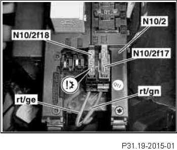 7. Plug the turquoise and back fuse holders (N10/2f17, N10/2f18) into the rear SAM control module with fuse and relay module (N10/2) and assign a 20 A fuse to each.