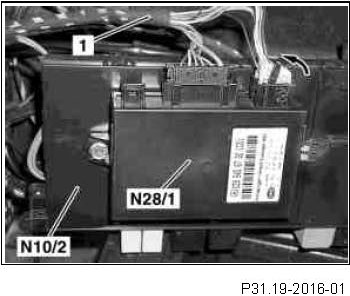 8. The trailer detection control module (N28/1) is clipped on the rear of the rear SAM control module with fuse and relay module (N10/2) into an existing strap and secured with a self-tapping 6 x 12 mm torx bolt.