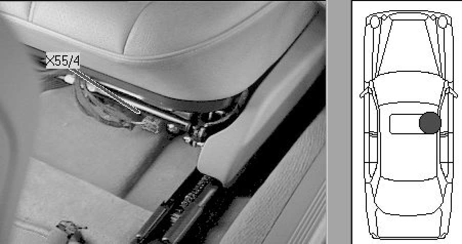 Beneath front passenger's seat (left side shown, right side is mirror image)