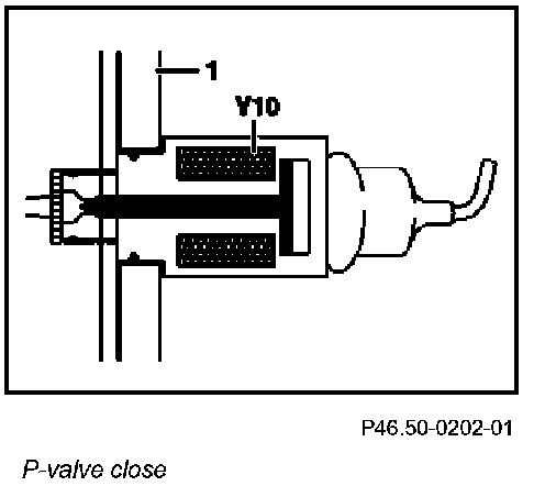The P-valve is actuaded in cycles with approx. 6V by the ETS, ASR or ESP control module (N47-1, N47-2, N47-5). As vehicle speed increases the current flow reduces and the P-valve opens the control restrictor continuously in accordance with a characteristic (K) defined in the control module. Consequently the oil flow is controlled and also the steering wheel torque.