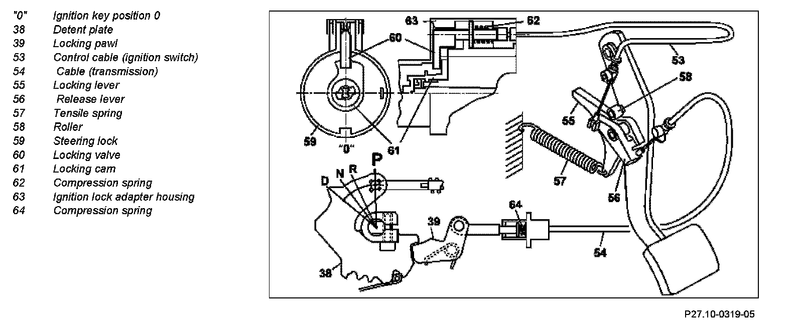 If the parking lock is engaged, the ignition key has been removed and the service brake is not activated, the locking pawl (39) blocks the detent plate (38). The park pawl cannot be released. The park pawl can only be released by turning the ignition key to position "'I " and pressing the brake pedal. Starting from ignition key position "1 " the locking cam (61) in the steering lock releases the control cable (53). When the brake pedal is depressed, the lock lever (55) and roller (58) are twisted down, the return spring at the brake pedal (57) is tensioned and the release lever (56) is released.